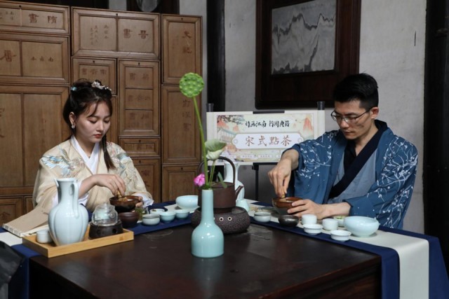 “詩(shī)畫(huà)江南 行閱典籍”曬書(shū)活動(dòng)之“宋式點(diǎn)茶”。費(fèi)騰輝攝