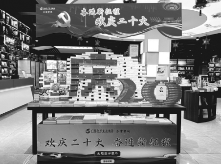 廣西新華書店集團(tuán)股份有限公司組織全區(qū)各連鎖門店先后開展了“喜迎二十大 助力新發(fā)展”主題圖書展示展銷、“歡慶二十大 奮進(jìn)新征程”主題系列活動(dòng)。廣西新華書店集團(tuán)股份有限公司相關(guān)負(fù)責(zé)人介紹,全區(qū)門店近期開展“歡慶二十大 奮進(jìn)新征程”主題門店美陳大賽,通過(guò)精選出111個(gè)全國(guó)近期出版的主題圖書品種進(jìn)行重點(diǎn)展示,配套主題海報(bào)、背景板,以各門店融合當(dāng)?shù)靥厣拇a堆造型進(jìn)行整體美陳,向廣大讀者推薦一批導(dǎo)向正確、質(zhì)量上乘的優(yōu)秀主題圖書。