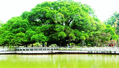 擁有古樹的城市就是擁有歷史的城市。福州古榕遍布,四季常青,是城市、市民生活與樹木的完美結(jié)合,是風(fēng)景的自然生長,是歷史根深葉茂地屹立。福州古榕以樹齡長、歷史久、數(shù)量眾而著稱。見證福州城市史的,當(dāng)首推鼓山國家森林公園、八一水庫旁,福州無人不知的已近千歲,被譽(yù)為福州榕樹王的古榕。相傳,這棵古榕是張伯玉所栽植的兩棵樹苖,光陰荏苒,同氣相求,如今兩棵榕樹相互糾結(jié)、勾連、纏繞、親密,已無分彼此。其冠幅達(dá)1300米,可容納千人在樹下談古論今,聊天遮陰。遠(yuǎn)望,似綠色陵巖;近看,知其為榕也,密密的枝葉把近午的陽光切割成碎花點(diǎn),散落、閃亮在榕樹下的草坪和地衣上。初訪者或?yàn)橛牣悾嘿即笠豢霉砰艆s不見氣根,知榕者會(huì)告訴你,這是一株碩大、古老而不生氣根的細(xì)葉榕。因其冠幅日益長大,為了支撐沉重的樹冠、預(yù)防主干折損,便制作了若干石柱,砥柱其間。古榕下有湖塘,錦鯉游泳,不時(shí)生出紅色漣漪。旁有一碑,上刻:榕蔭照水波心漾,觀魚猶勝花間行。