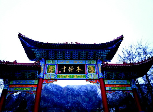 “素練披新山,銀樹(shù)列白川。”冬日的木梯寺被陣陣寒意包圍,顯得更加厚重。彩色牌樓挺立在白茫茫的山間,被襯托得分外鮮艷,“木梯寺”三個(gè)大字雄宏大氣,配合著這壯觀的景色,琉璃瓦下綴著水晶冰柱,像俏皮的小尾巴,為這幅水墨畫(huà)更增添了幾分頑皮。