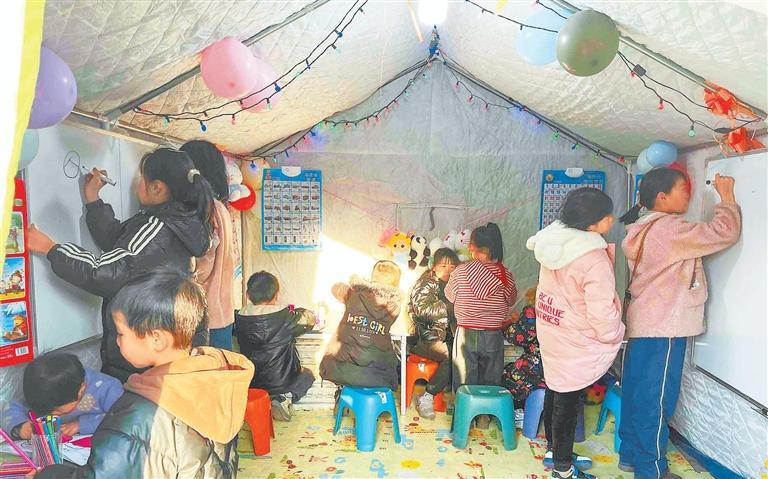 12月24日下午,積石山縣大河家鎮(zhèn)大河村安置點(diǎn)上,傳來孩子們瑯瑯讀書聲。