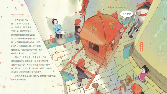 書中提到了在墻面削個角、弄個彎,“拐彎抹角”、方便大家行走的謙讓智慧;齊心協(xié)力,共同出資出力蓋房子的和諧智慧;技術(shù)和藝術(shù)并存,用榫卯聯(lián)結(jié)構(gòu)件的建構(gòu)智慧;防患于未然,保證人們生命、生活安全的防患智慧……