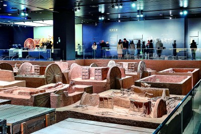 在二樓展廳展出的名為“陶”的文物,形狀呈圓餅狀,表面微微凸起,密密麻麻,這是商朝人洗澡時的清潔用具。殷墟考古發(fā)掘工作中,發(fā)現(xiàn)一種車,車前俯身埋著兩個人,這很可能是一種人力車,文獻(xiàn)稱為“輦車”。在“車轔轔,馬蕭蕭”展廳,社科院考古所現(xiàn)場考古,把發(fā)掘過程展示給游客。