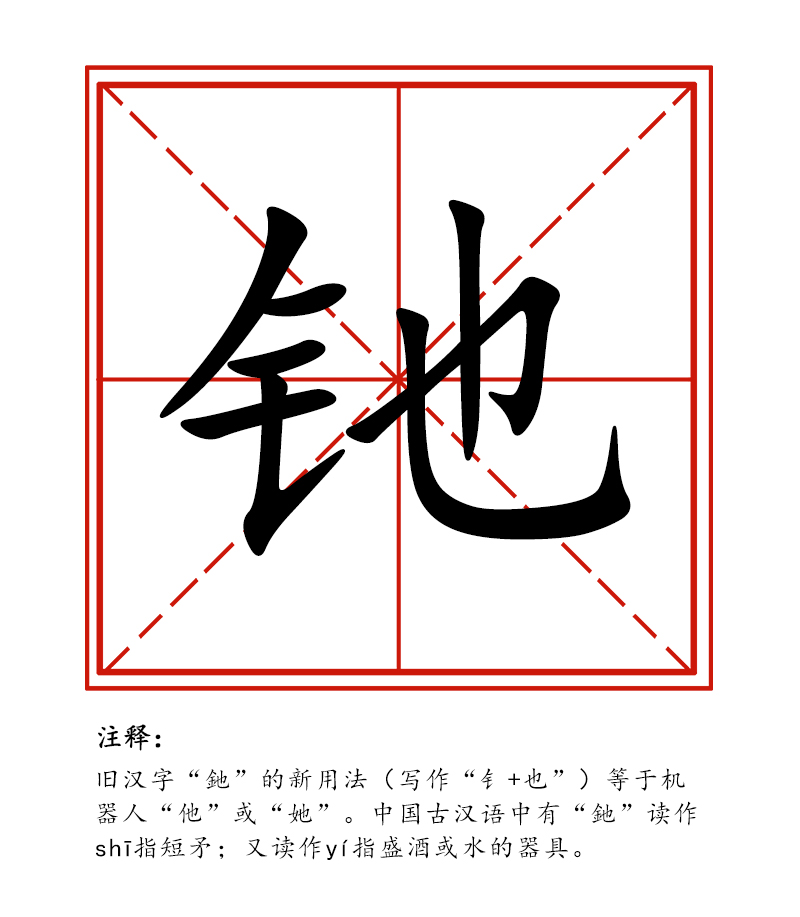 中國(guó)甘肅網(wǎng)1月23日訊 近日,范鵬教授通過朋友圈為舊漢字“釶”發(fā)明了一種新用法,寫作“钅+也”,將其定義為等同于機(jī)器人的“他”或“她”。