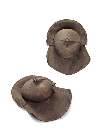 先看前加沿笠帽,大家看是不是有些眼熟?沒(méi)錯(cuò),這頂帽子與影視劇中英雄俠客們所戴的帽子很相似,《神探狄仁杰》里的李元芳、《水滸》中的林沖外出時(shí)就戴類(lèi)似的帽子。為什么要戴這樣的加沿笠帽呢?為了遮光啊。別小瞧這頂前加沿笠帽,它的背后還有一段歷史故事呢:相傳元世祖忽必烈騎馬射獵時(shí)覺(jué)得日光太過(guò)炫目,聰慧體貼的皇后便為他設(shè)計(jì)了這種前面加沿的帽子,戴這種加沿帽遮光效果就好多了,忽必烈非常喜歡,便將這種式樣固定了下來(lái),以后國(guó)人紛紛效仿,成為流行款式。可是,唐宋是在元之前,元芳和林沖似乎不該戴類(lèi)似的帽子?既是藝術(shù)形象,就不用深究了吧。人類(lèi)智慧相通,英雄更是惺惺相惜,既都是英雄,戴上同款的帽子也是應(yīng)有之義。