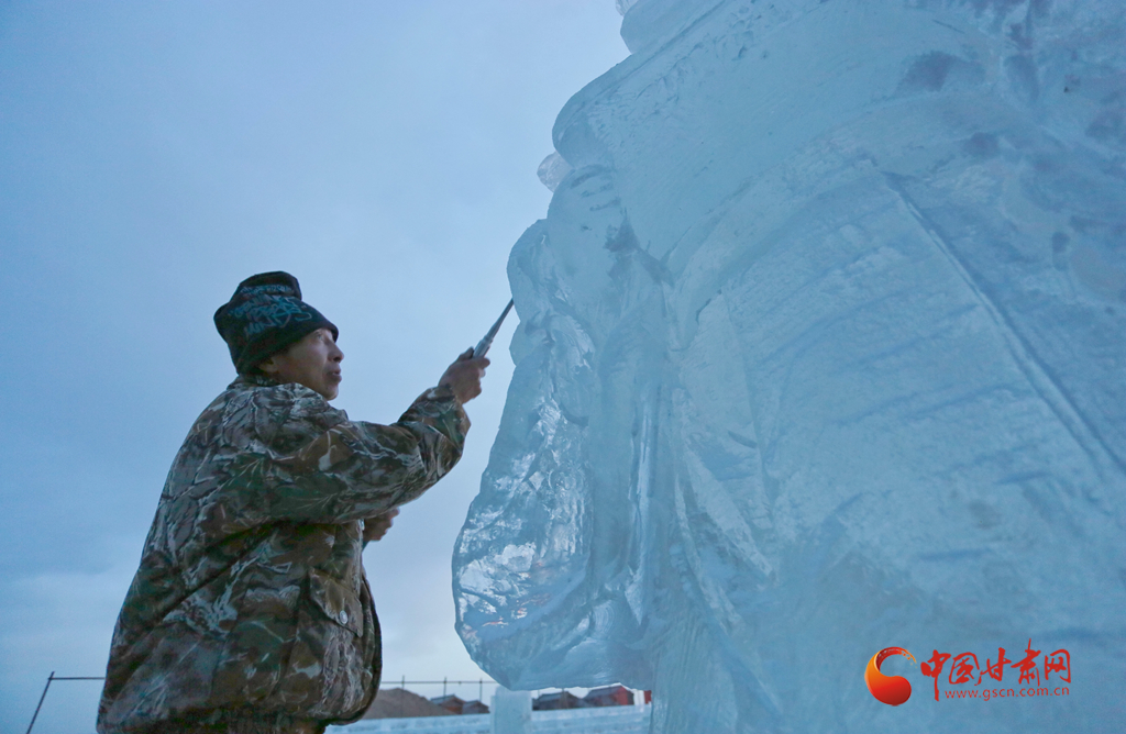 春節(jié)將近,甘肅省張掖市甘州區(qū)屋蘭古鎮(zhèn)九曲黃河燈陣景區(qū)的冰雕工藝師們加班加點趕制愛國主義教育、長城、絲綢之路盛景、人們幸福美好生活等大型主題冰雕,在即將到來的春節(jié)為游客和市民展現(xiàn)精美的冰雕藝術(shù)大餐。