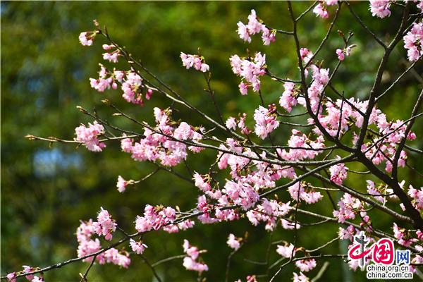 沿著蜿蜒的旅游公路,兩旁海拔600多米的山坡上開滿了櫻花,一簇簇櫻花投印在蒼翠山麓與柳綠間,潔白的、粉色的、玫紅的花朵,迎風搖曳,儼然一副七彩水墨畫。