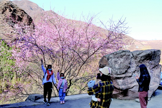 3月22日,游客在崆峒后峽賞花拍照。記者  姚志強(qiáng) 攝