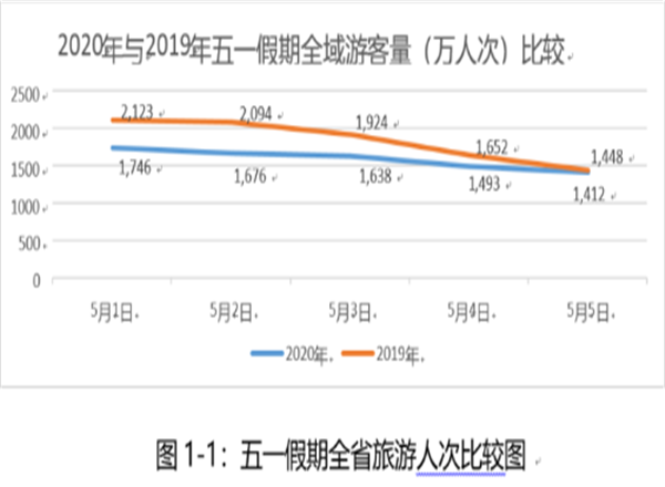 “五一”假期期間全省全域旅游人次7965.1萬人次,較去年同期9240.4萬人下降13.8%。