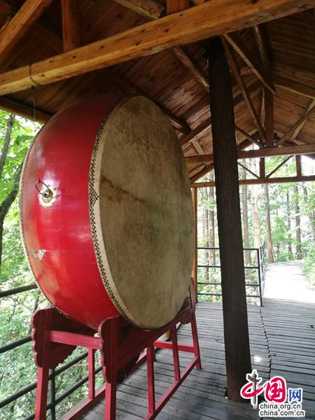不知是何等神力相助,我竟然氣不急喘,腿不灌鉛,一口氣沖到了大鐘處。在一處長(zhǎng)約兩百米,寬約五六米的突兀石崖下,竟然有一條長(zhǎng)百米寬約三米的平坦棧道,直抵懸崖石壁,仿佛一條地道的天街。從懸崖上吊掛下來一尊重達(dá)千斤的銅鐘,鐘邊吊一根木質(zhì)鐘錘,錘身已裂開,兩頭均被撞成起毛的“絨團(tuán)”,由此可知,到達(dá)此處撞鐘的勇士并非少數(shù)。我乘興上去重重地撞了九下,雄渾、恢弘的鐘聲,在峽谷上空久久地回蕩。