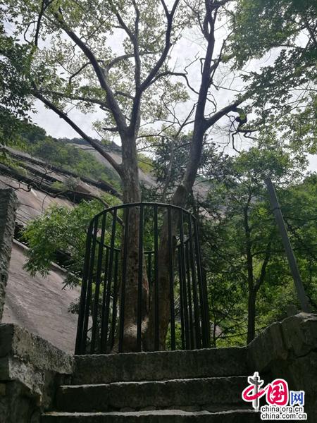 于是,我開始沿著陡峭的石階,一步一步地向上攀登。上不過百余級(jí),一株如巨傘狀的天目紫莖躍然眼前。樹四周用茶杯粗細(xì)鋼筋柵欄緊緊圍住,可見景區(qū)對(duì)此珍貴名木的重視。仔細(xì)觀察,估計(jì)樹齡至少在500年以上,其主干樹皮細(xì)滑,骨感十足,上部枝丫自然舒展,覆蓋出去,周圍各色綠樹恰似眾星拱月般,與其相擁成趣。