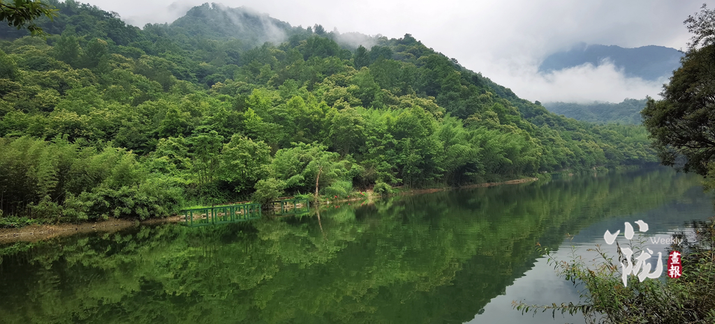 撐一葉竹筏在月牙潭之上,碧波蕩漾,山水一色,你能清晰的看見水底機靈的魚群,因你們闖入,驚慌的竄入沉積在水底的石縫中。遠遠望去,翠嶺逶迤,湖中碧波如鏡,嵐影倒懸,人在畫中游的意境躍然于心。
