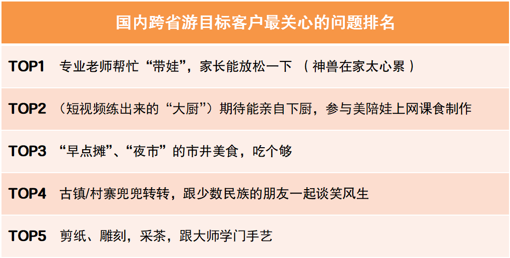 通過針對中青旅遨游網(wǎng)會員、中青旅聯(lián)盟成員單位的忠實客戶等群體的調研,以及近半年中青旅遨游網(wǎng)搜索、瀏覽的監(jiān)測數(shù)據(jù)進行綜合分析。結果顯示,西南和西北是客戶喜好程度最高的兩大地域;云南、江蘇、新疆、三亞、陜西是客戶喜好程度最高的五大熱門目的地??蛻糇铌P心的問題,帶娃、參與、美食、閑逛、學藝則位列前五名。