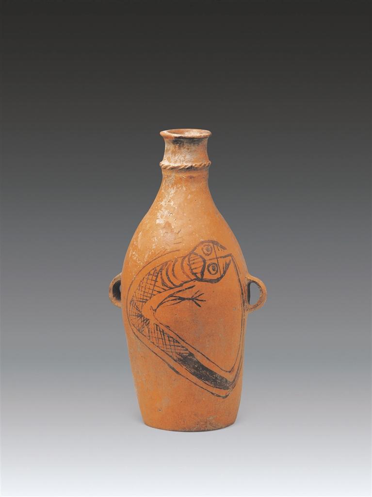 “鯢魚紋彩陶瓶”(距今約 5200 年),這是只工藝非常精美的彩陶瓶,式樣與后世的瓶一般無二了。更令人贊嘆的是勻稱凈美的瓶身上繪的一只娃娃魚,也就是學(xué)名鯢魚的彩繪! 這只娃娃魚雙目圓睜,大口露牙,長(zhǎng)條曲折狀身軀,首尾相接,兩側(cè)飾爪形紋。彩陶瓶上的娃娃魚圖案繪得如此生動(dòng)傳神,給這件精美的彩陶瓶平添了許多神秘意境和藝術(shù)魅力。