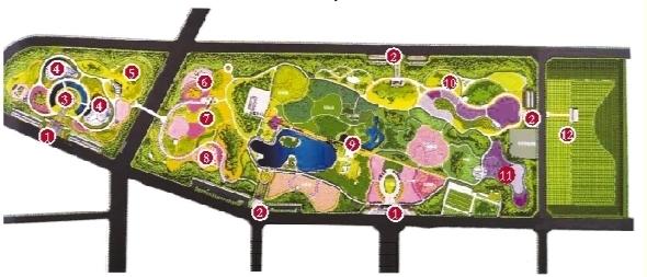 蘭州植物園二期規(guī)劃平面示意圖。 11 ①主入口 ②次入口 ③鏡湖云游 ④溫室植物園 ⑤藥用植物園 ⑥珍稀植物園 ⑦纖維植物園 ⑧兒童植物園 ⑨蘭州特色園 ⑩旱生植物園 彩葉植物園 生態(tài)培育 12