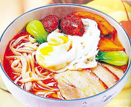 其實(shí),桃花面指的不是面條,而是面條的配料,亦如我們的“牛肉面”“臊子面”中的“牛肉”和“臊子”。不同于“牛肉”和“臊子”的是,桃花面中的“桃花”亦不是枝頭的那片美艷,而是擺在碗中面條上的一片誘人口水的燒肉、一個(gè)金黃的丸子、一個(gè)白白嫩嫩的荷包蛋外加幾根青翠怡人的菠菜。在碗口這個(gè)不大的天地間,綠的是新芽,黃的如花蕊,相間在紅肉白蛋里,自然有了桃花的寫(xiě)意,故名“桃花面”。