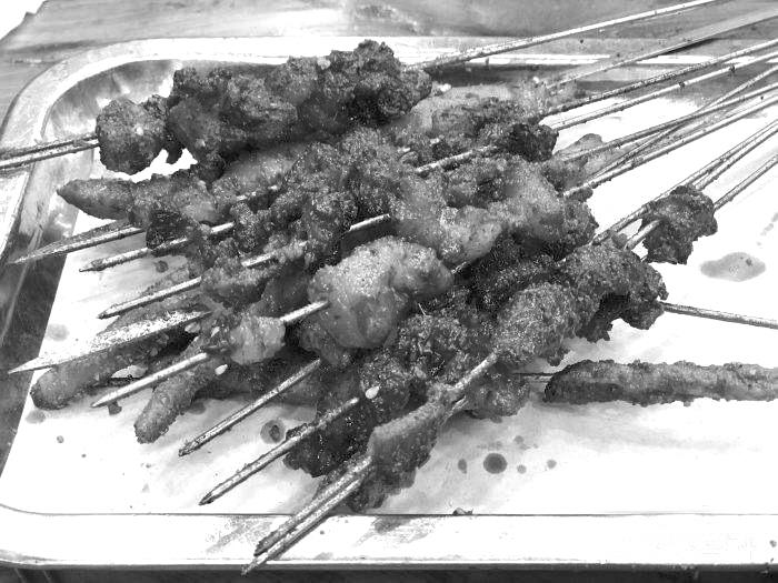一般到下午四五點(diǎn)鐘就賣完了,把生意留給對面的烤肉??救鈱儆诟煽镜牧髋?,每一串都是三瘦一肥,很香。