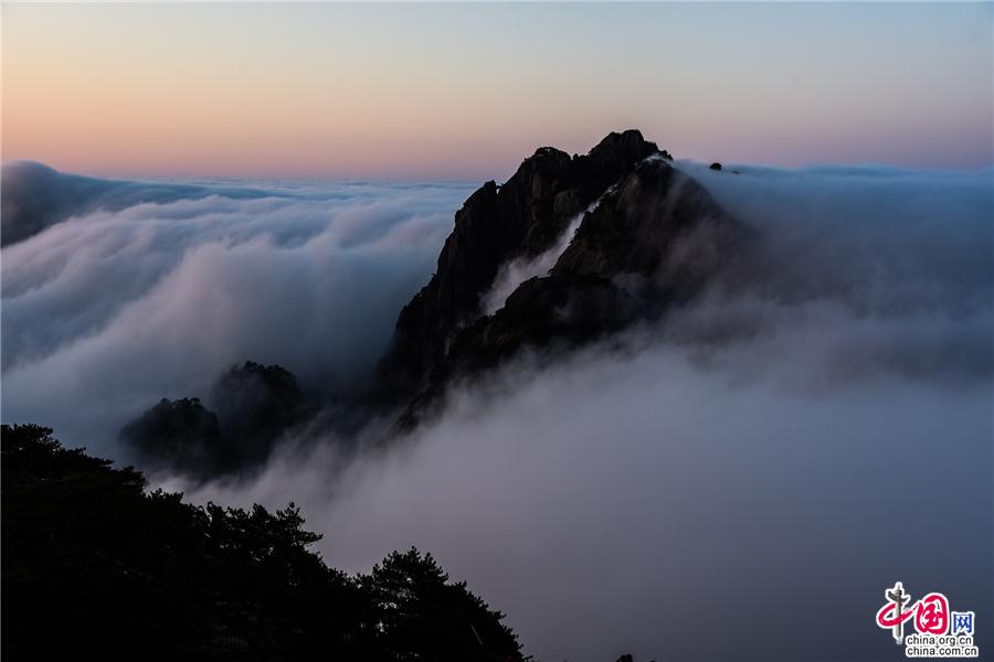 凌晨,當(dāng)云海隨著氣流漫過天都峰與蓮花峰時瘋狂的傾瀉而下,浩浩蕩蕩直奔東方注入大海,成就浩瀚的海洋。