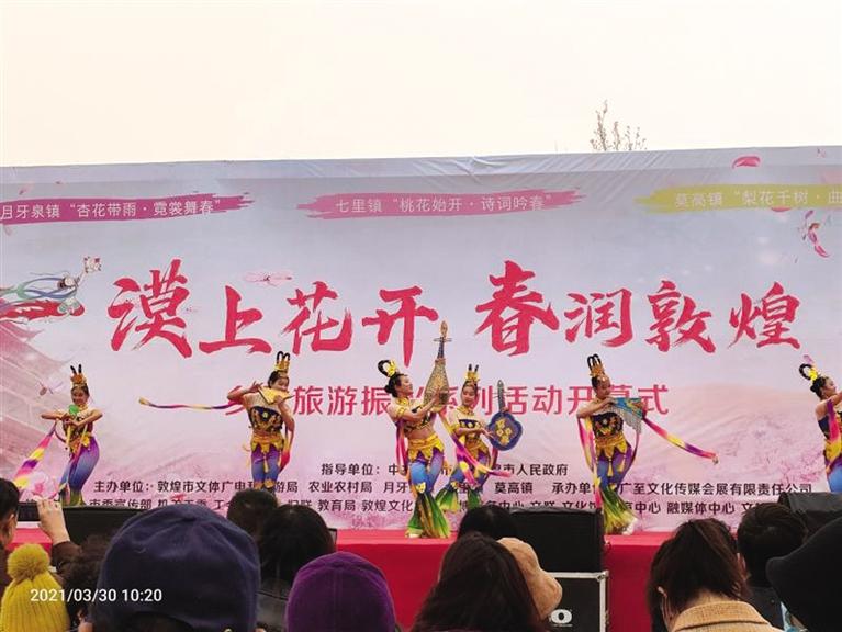 三月的敦煌,春風拂面,漠上花開。鳴沙山下,十里杏花爭相綻放;黨河兩畔,千畝桃花含苞待放;春風蕩漾,早酥梨基地花苞滿枝丫。鮮花以自己的嬌媚打開了戈壁大漠的春天。敦煌市將以“春”為韻腳,“花”為主角,開展“漠上花開·春潤敦煌”鄉(xiāng)村旅游振興系列活動。包括“杏花帶雨·霓裳舞春”“桃花始開·詩詞吟春”“梨花千樹·曲藝鬧春”3場主場活動,以及徒步踏青、康體騎行、研學體驗等5項主題活動,并將組織開展敦煌服走秀、桃花詩會、非遺曲子戲表演等多項鄉(xiāng)村旅游特色配套活動。