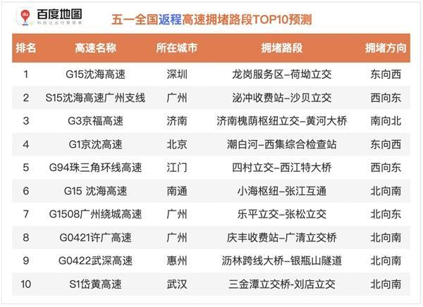 ?。?021年五一假期返程高速擁堵路段TOP10預測)