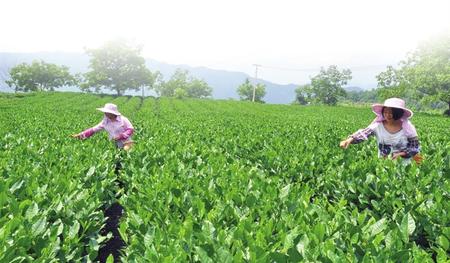 碧口鎮(zhèn)馬家山生態(tài)茶園里茶農(nóng)采摘夏茶