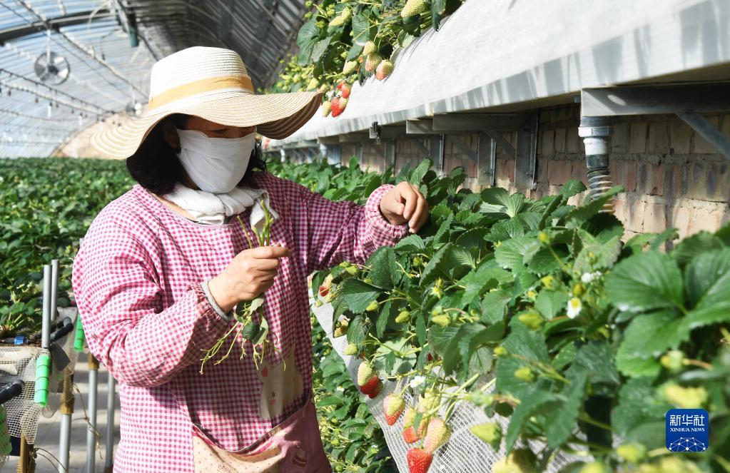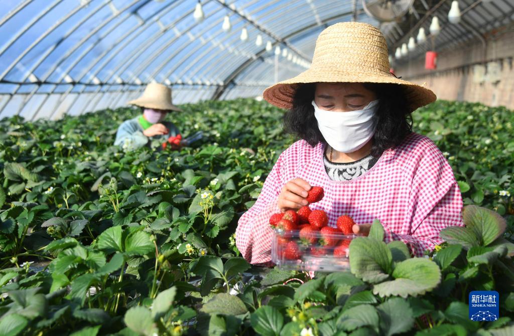 2月20日,工作人員在北京百旺農(nóng)業(yè)種植園草莓種植大棚采摘草莓。