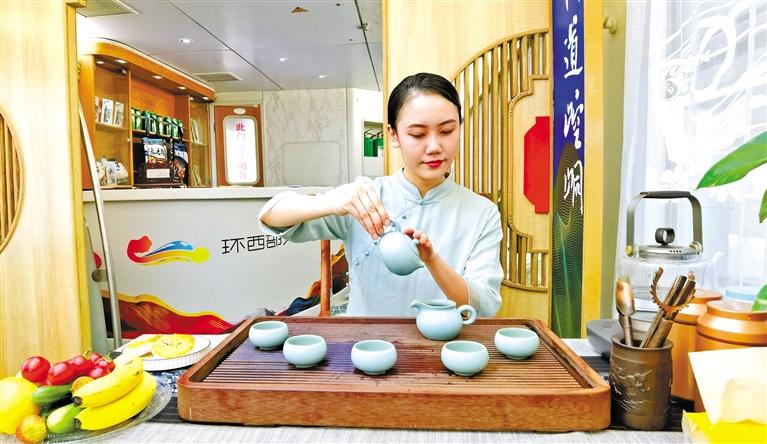 這趟列車由6節(jié)軟臥車廂、1節(jié)餐車、1節(jié)休閑娛樂功能車組成,車體內(nèi)外隨處可見平?jīng)鑫幕糜卧亍S浾咴谲噹麅?nèi)看到,崇信龍泉寺、華亭安口窯古村落、靜寧仙人峽……每一間軟臥門上都是絕美的平?jīng)鲲L(fēng)光大片,整個車體儼然移動的“平?jīng)鑫穆谜桂^”,讓人“身未動,心已遠”。車體中部的功能車,更是顛覆了以往人們對火車的認知,麻將桌、功夫茶、全套的K歌設(shè)備,還有平?jīng)鎏厣穆蒙唐?、農(nóng)特產(chǎn)品展銷區(qū),平?jīng)鑫穆脮営[區(qū)、平?jīng)鑫幕黝}報刊欄,足以打發(fā)游客在旅途中的無聊時光。餐車也極富特色,車廂頂部裝飾有色彩豐富的藻井圖案,飛天仙子衣袂飄飄、環(huán)繞四周。“在這樣的餐車上吃飯,吃的那是品位。”一位乘客開心地和同行的伙伴說著。62歲的張女士一到平?jīng)鼍兔Σ坏亟o女兒發(fā)微信,“火車上住得舒適,服務(wù)好,環(huán)西部火車游·崆峒號很超值!”