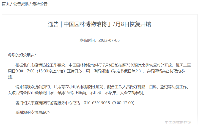 中國(guó)園林博物館發(fā)布最新消息,根據(jù)北京市疫情防控工作要求,中國(guó)園林博物館7月8日起按照75%限流比例恢復(fù)對(duì)外開(kāi)放。