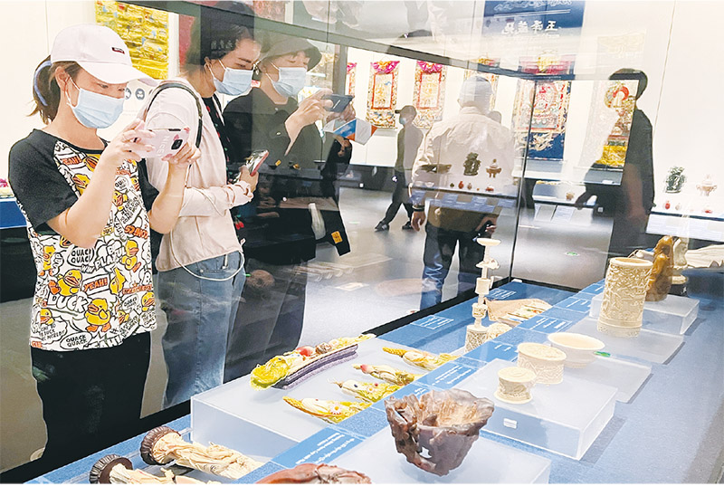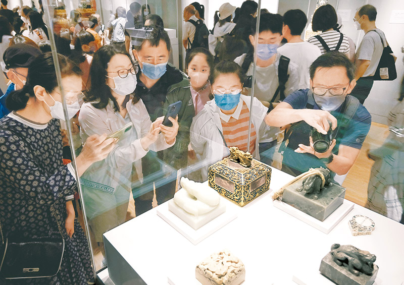 2022年7月3日,香港故宮文化博物館正式對公眾開放參觀。圖為觀眾在香港故宮文化博物館展廳內(nèi)參觀拍照?!⌒氯A社記者 王申/攝