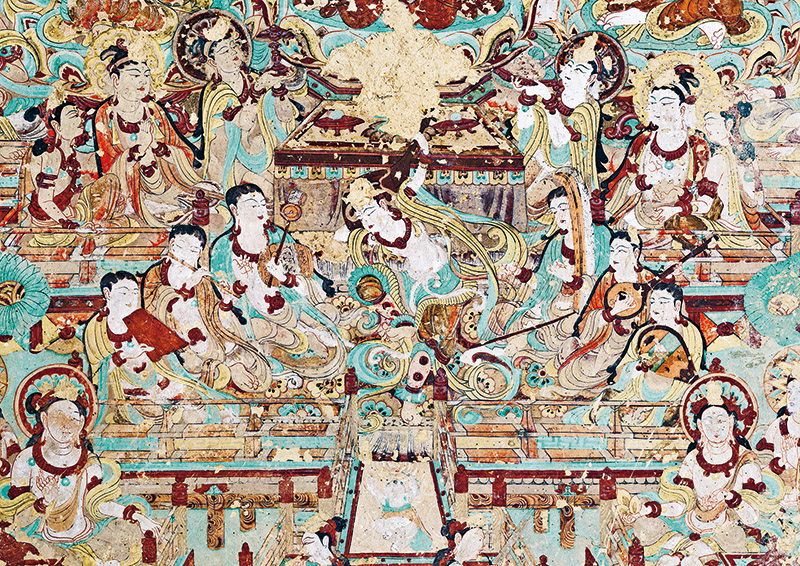 敦煌文化延續(xù)近兩千年,是世界現(xiàn)存規(guī)模最大、延續(xù)時間最長、內(nèi)容最豐富、保存最完整的藝術(shù)寶庫,是世界文明長河中的一顆璀璨明珠,也是研究我國古代各民族政治、經(jīng)濟、軍事、文化、藝術(shù)的珍貴史料。圖為莫高窟第112窟南壁壁畫“反彈琵琶樂舞圖”。 敦煌研究院供圖
