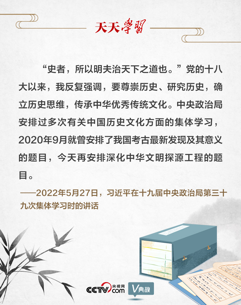 為深入了解中華文明五千多年發(fā)展史,推動(dòng)把中國(guó)文明歷史研究引向深入,推動(dòng)全黨全社會(huì)增強(qiáng)歷史自覺、堅(jiān)定文化自信,2022年5月27日,十九屆中央政治局就深化中華文明探源工程進(jìn)行第三十九次集體學(xué)習(xí)。習(xí)近平總書記引用古語“史者,所以明夫治天下之道也”,強(qiáng)調(diào)要尊崇歷史、研究歷史,確立歷史思維,傳承中華優(yōu)秀傳統(tǒng)文化。