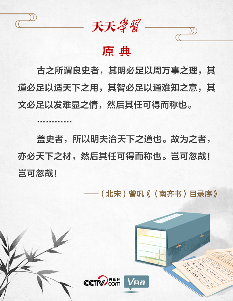 《〈南齊書〉目錄序》是曾鞏為“二十四史”之一的《南齊書》所寫的一篇序文,體現(xiàn)了曾鞏的史學(xué)研究?jī)r(jià)值取向。文章圍繞著“良史(優(yōu)秀的史官)”二字展開。曾鞏認(rèn)為,“古之所謂良史者,其明必足以周萬事之理,其道必足以適天下之用,其智必足以通難知之意,其文必足以發(fā)難顯之情”。曾鞏在唐代史學(xué)家劉知幾“史才三長(zhǎng)(才、學(xué)、識(shí))”基礎(chǔ)上,將“良史”的標(biāo)準(zhǔn)引申為四點(diǎn):明、道、智、文。其中,文、明、智相當(dāng)于才、學(xué)、識(shí),而“道”則是曾鞏的發(fā)展,并被擺在核心位置。曾鞏指出,“蓋史者,所以明夫治天下之道也。故為之者,亦必天下之材”。曾鞏認(rèn)為,史書要闡明治國(guó)安邦的法則和規(guī)律,因此史家必須是兼具明、道、智、文的“天下之材”。他提出史家要發(fā)揮史學(xué)經(jīng)世致用的作用,修史要總結(jié)前朝興亡的經(jīng)驗(yàn)教訓(xùn),為后世提供“法戒”。