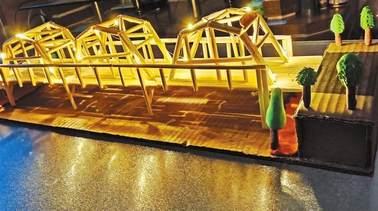 “平時去看中山橋只覺得它很美,現(xiàn)在覺得當(dāng)時建造它一定很不容易。”馬靜怡同學(xué)和媽媽用一次性筷子制作的中山橋模型,與實物外觀頗為相似,為了呈現(xiàn)中山橋拱形鋼架的效果,馬靜怡裁筷子再拼粘費了一番工夫。大橋模型制作好了,她對中山橋也有了更深的認(rèn)識。
