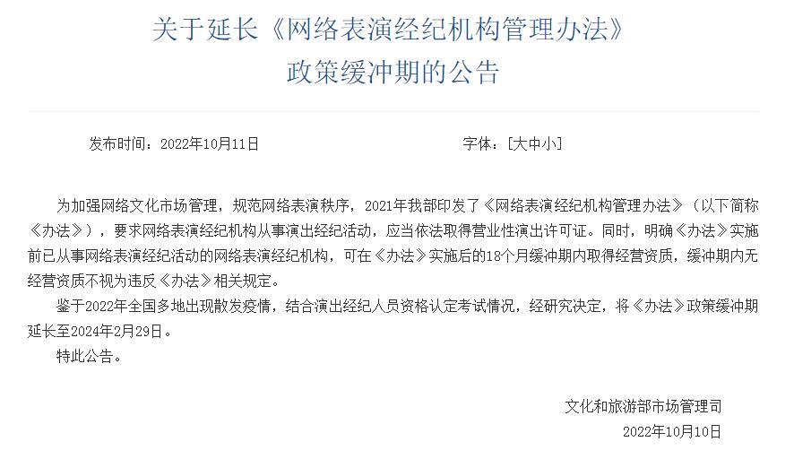 原標(biāo)題:文旅部:延長(zhǎng)《網(wǎng)絡(luò)表演經(jīng)紀(jì)機(jī)構(gòu)管理辦法》政策緩沖期