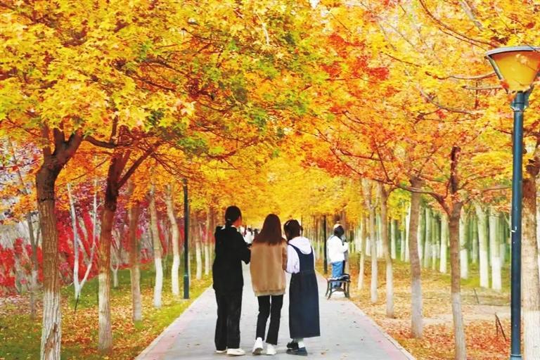 微風(fēng)輕拂,嬌黃的樹(shù)葉紛紛飄落,陽(yáng)光透過(guò)葉片滲出幾分清朗,這是專(zhuān)屬秋的浪漫。隨便鋪開(kāi)畫(huà)紙,蘸取一點(diǎn)點(diǎn)秋色,藍(lán)天、紅墻、金葉……都是最美的色調(diào)。古樸靜雅的校園彌漫著秋思,斑駁的陽(yáng)光灑在圖書(shū)館的墻上,在濃濃的書(shū)卷氣中把農(nóng)歷十月寫(xiě)進(jìn)秋的詩(shī)行,有思念、有沉淀、有墨香……蘭州“醉”美的大學(xué)校園,每一片落葉都是美的化身,綿延了時(shí)光,溫情了步履……