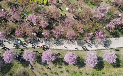 這是3月8日拍攝的都江堰市青城山鎮(zhèn)“問花村”櫻花大道一角(無人機照片)