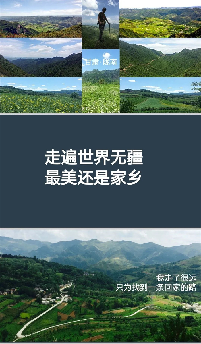 我每次回到西北各省區(qū)參加活動(dòng),做演講分享時(shí),總會(huì)放幾頁(yè)P(yáng)PT介紹我的家鄉(xiāng)——大隴南,配圖都是我拍攝的我們村莊附近的風(fēng)光,也經(jīng)常說(shuō)一句話(huà)——“走遍世界無(wú)疆,最美還是家鄉(xiāng)”,不辭長(zhǎng)作隴南人。