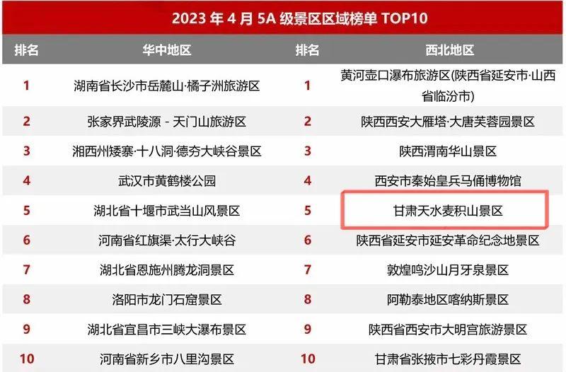 最新5A級景區(qū)百強(qiáng)出爐!麥積山大景區(qū)上榜!