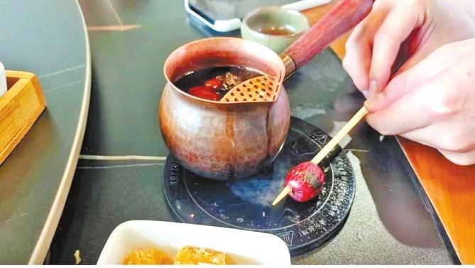 “‘茶圣’陸羽的《茶經(jīng)·五之煮》記載,煮茶的時候會放蔥、姜、棗、橘皮、茱萸、薄荷等佐料,所以現(xiàn)在罐罐茶所添加的配料,如紅棗、枸杞、桂圓、葡萄干、菊花、冰糖等,其實(shí)就是最原始的煮茶法的延續(xù)。”唐陳虓說。