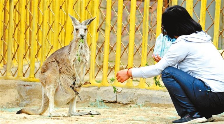 而7個月大的灰袋鼠還躲在媽媽的育兒袋里,飼養(yǎng)員說還有一個月,它就可以下地走路了。