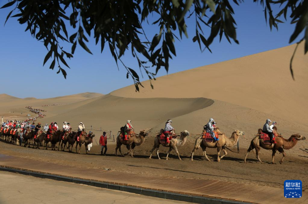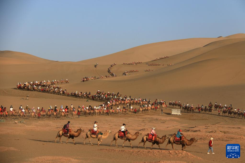 初秋時(shí)節(jié),甘肅省敦煌市碧空如洗,鳴沙山月牙泉景區(qū)景色如畫,引人入勝。