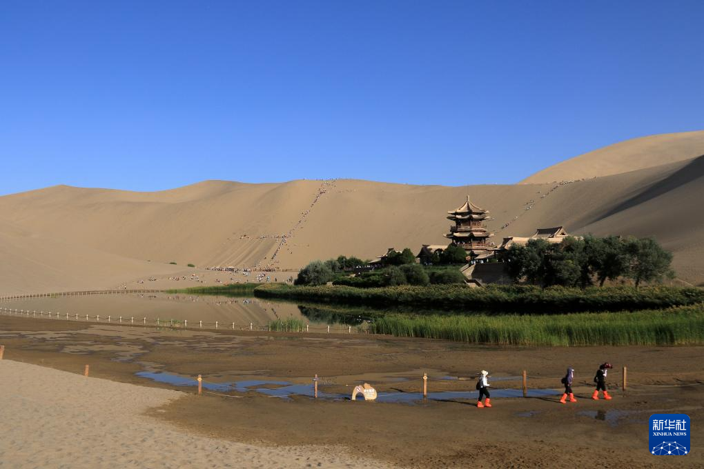 8月20日,游客在甘肅省敦煌市鳴沙山月牙泉景區(qū)游覽。新華社發(fā)(張曉亮攝)