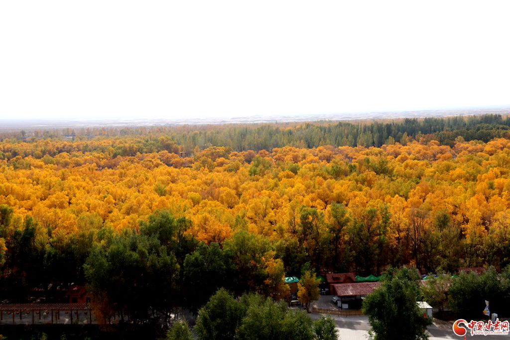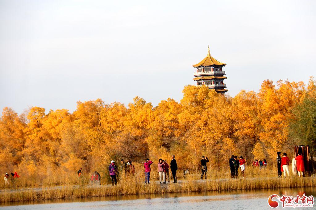 秋高氣爽,金塔沙漠胡楊林景區(qū)進(jìn)入最佳觀賞期,大片胡楊由翠綠轉(zhuǎn)成金黃,與湛藍(lán)的天空交相輝映。在蒼茫大漠之上,萬(wàn)畝胡楊層林盡染,形態(tài)各異的胡楊巍然屹立,依水而生。