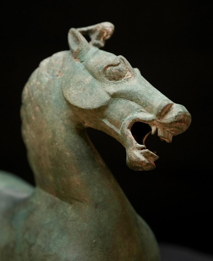 馬兒如在空中飛馳,一足踏上飛鳥的剎那,飛鳥回首驚顧。細(xì)細(xì)觀之,馬的口、眼、鼻均張開,鬃毛和尾絲后揚(yáng),令人仿若聽見馬兒奔騰的嘶鳴和風(fēng)嘯聲,靜態(tài)的青銅器充滿靈動(dòng)之感。