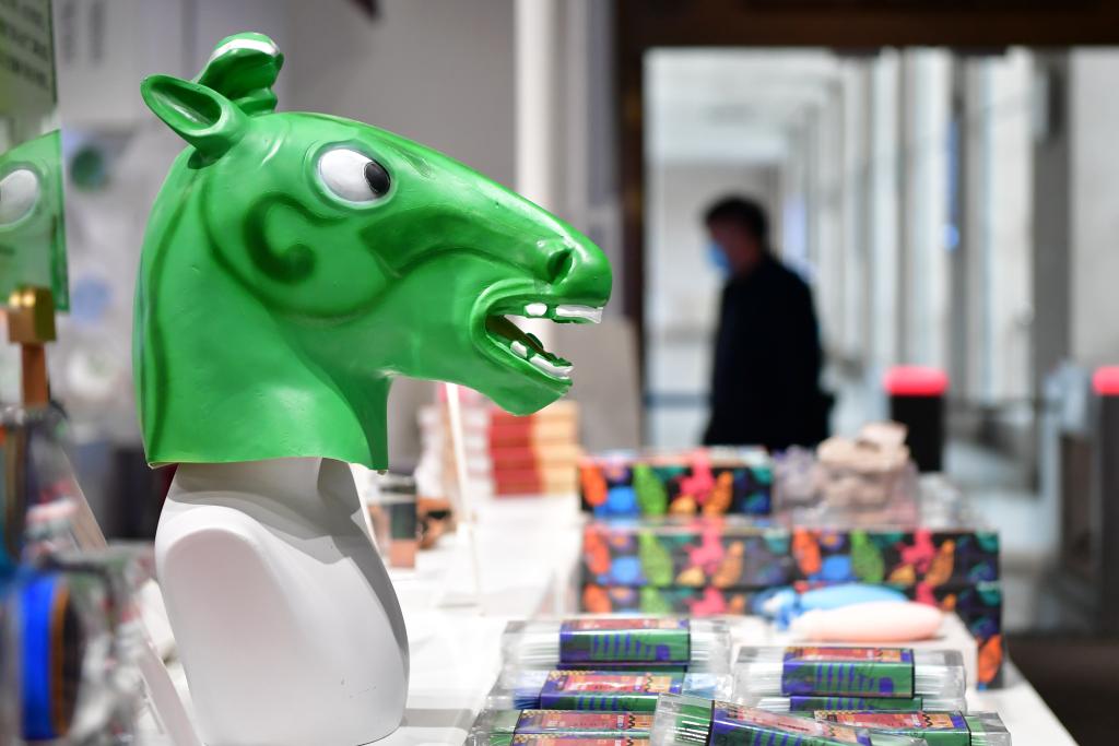 在甘肅省博物館文創(chuàng)商店拍攝的以銅奔馬為主題設(shè)計(jì)的“綠馬頭套”(2022年5月13日攝)。新華社記者 陳斌 攝