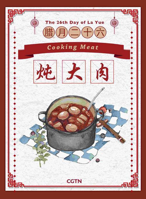 臘月二十六這天,許多家庭通常都會(huì)燉豬肉和吃豬肉。不養(yǎng)豬的家庭會(huì)去當(dāng)?shù)丶匈I一大塊肉。在過去的農(nóng)業(yè)社會(huì),人們只有在春節(jié)才能吃上肉。吃肉也代表著一年中最盛大的慶?;顒?dòng)。