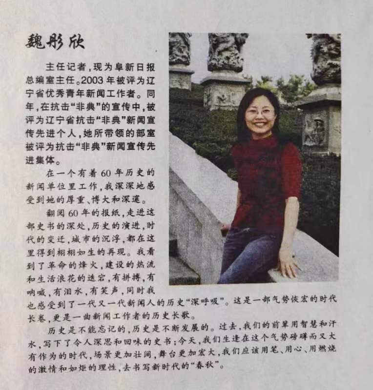 魏彤欣1993年進(jìn)入阜新日?qǐng)?bào)社做記者,她給自己定的努力方向就是:到一線去,到平凡的生活中去,歌頌美好情操,弘揚(yáng)時(shí)代精神。她撰寫(xiě)的20余篇新聞作品榮獲省級(jí)以上新聞獎(jiǎng)項(xiàng),她本人榮獲阜新市十大女杰、遼寧省十佳新聞工作者等多項(xiàng)榮譽(yù)。