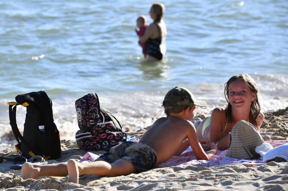 ↑冬日的海南三亞艷陽高照,外國小朋友在三亞市大東海玩耍。新華社記者 郭程 攝(資料圖片)