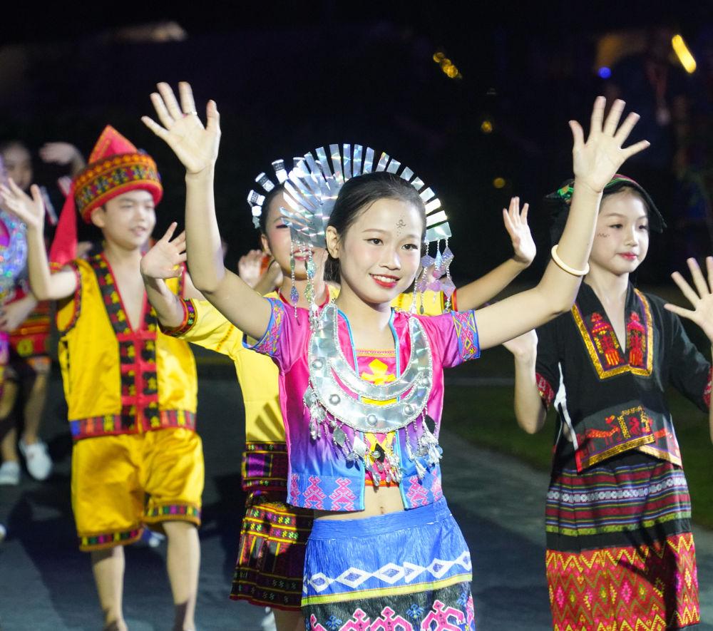 ↑2023年9月16日,海南省五指山市民族時裝“村秀”系列文化活動開幕。鄉(xiāng)鎮(zhèn)居民身著黎族、苗族傳統(tǒng)和創(chuàng)新設(shè)計(jì)服飾,向人們展示民族傳統(tǒng)文化的魅力。圖為展示服裝的小朋友與觀眾互動。新華社記者 樊雨晴 攝
