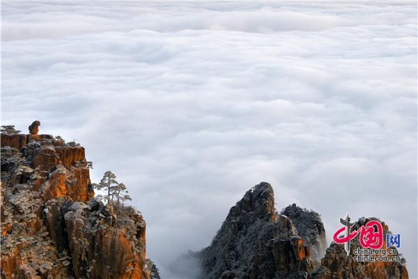 冬天的黃山絕美之處莫不過于雪景、霧凇、日出、云海同時出現(xiàn),1月5日雪后早晨一輪紅日冉冉升起,在陽光的照耀下,放射出萬丈光芒,在群峰間、奇松怪石上散發(fā)著金燦燦的光彩,給冬景增添神奇的色彩,美輪美奐宛如油畫。
